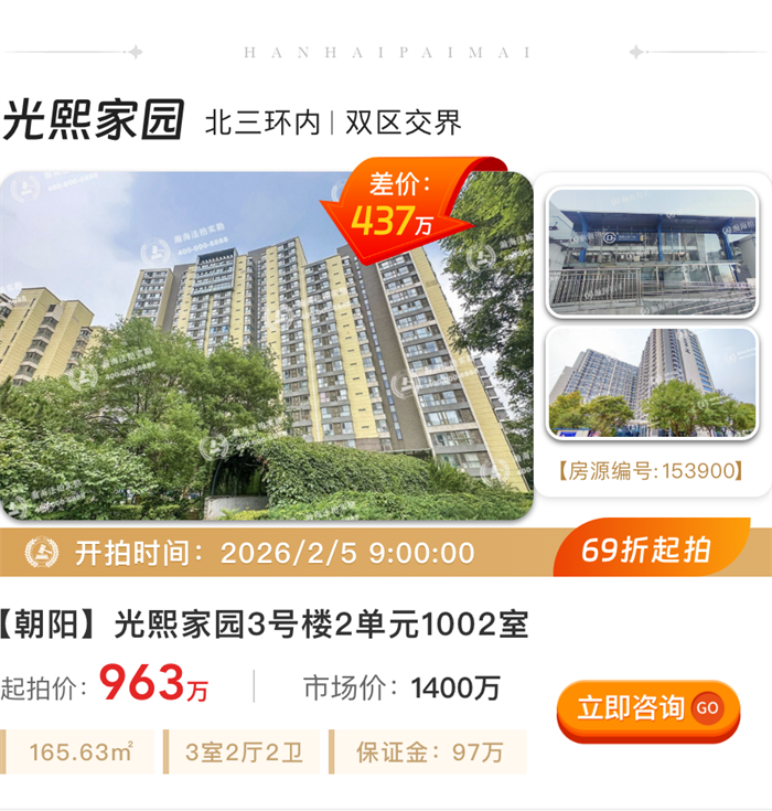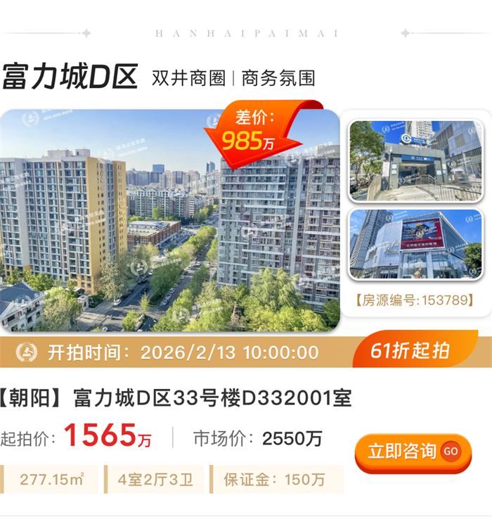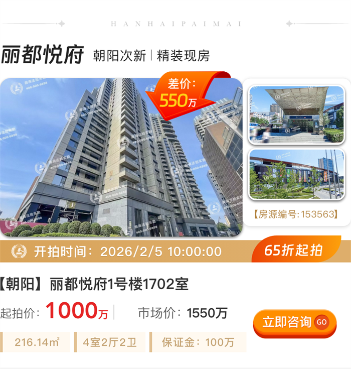 ①实景现房:丽都悦府位居东四环,邻近望京商务区,接壤燕莎使馆区,是2022年建成的精装修实景现房,上拍房源为开发商新房。