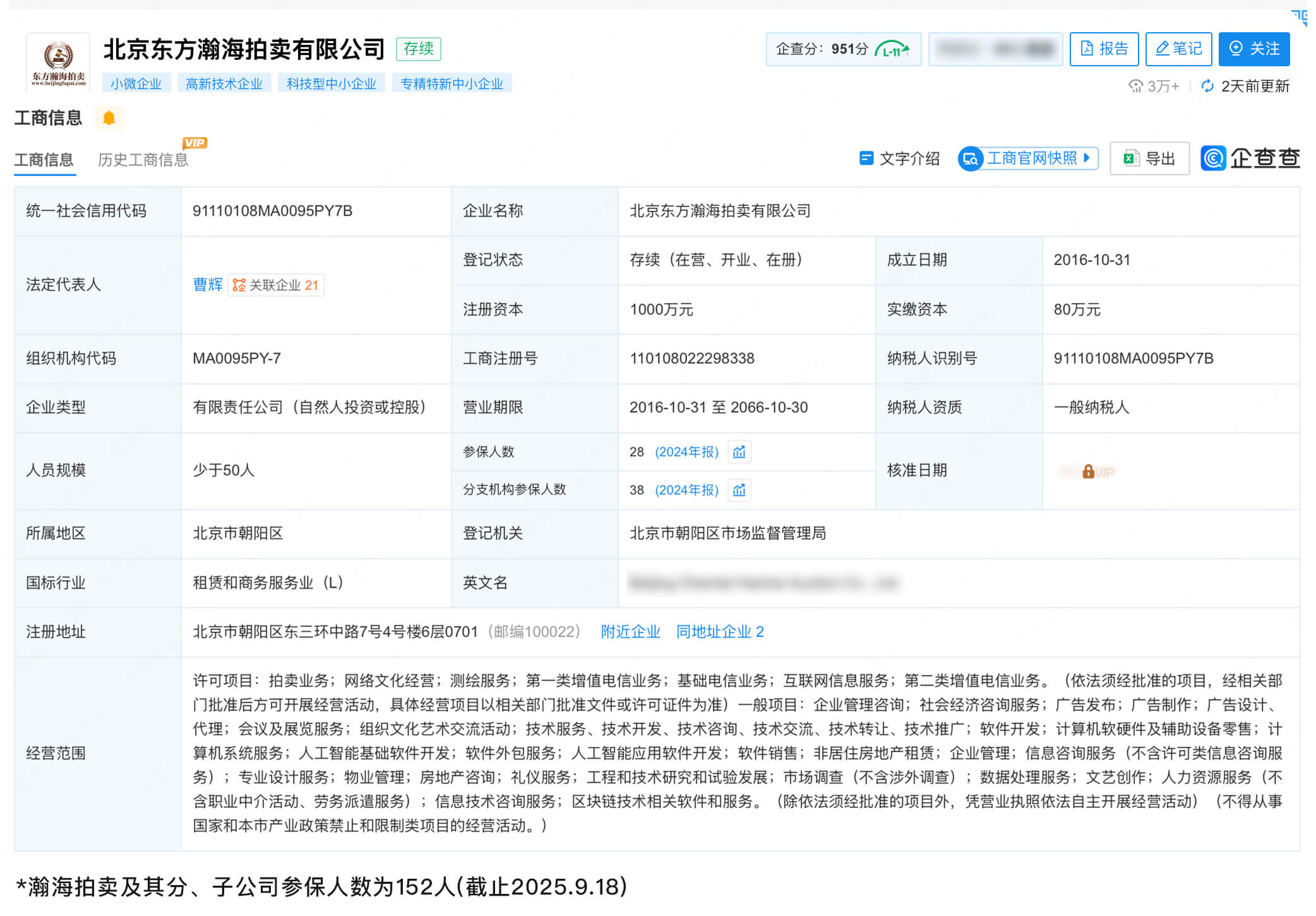 避坑贴士:客户可通过“企查查、启信宝、北京社保局”等网站,查看拍卖机构的“真实缴纳社保在职员工数量”,了解其宣称规模的真实性;未给员工缴纳社保的企业,首先属于违反《劳动法》行为,且如果员工在工作承诺和服务上出现任何问题和纠纷,类似机构都会推脱责任甩锅说是合作临时工,其被欺造成的损失都和机构无关。