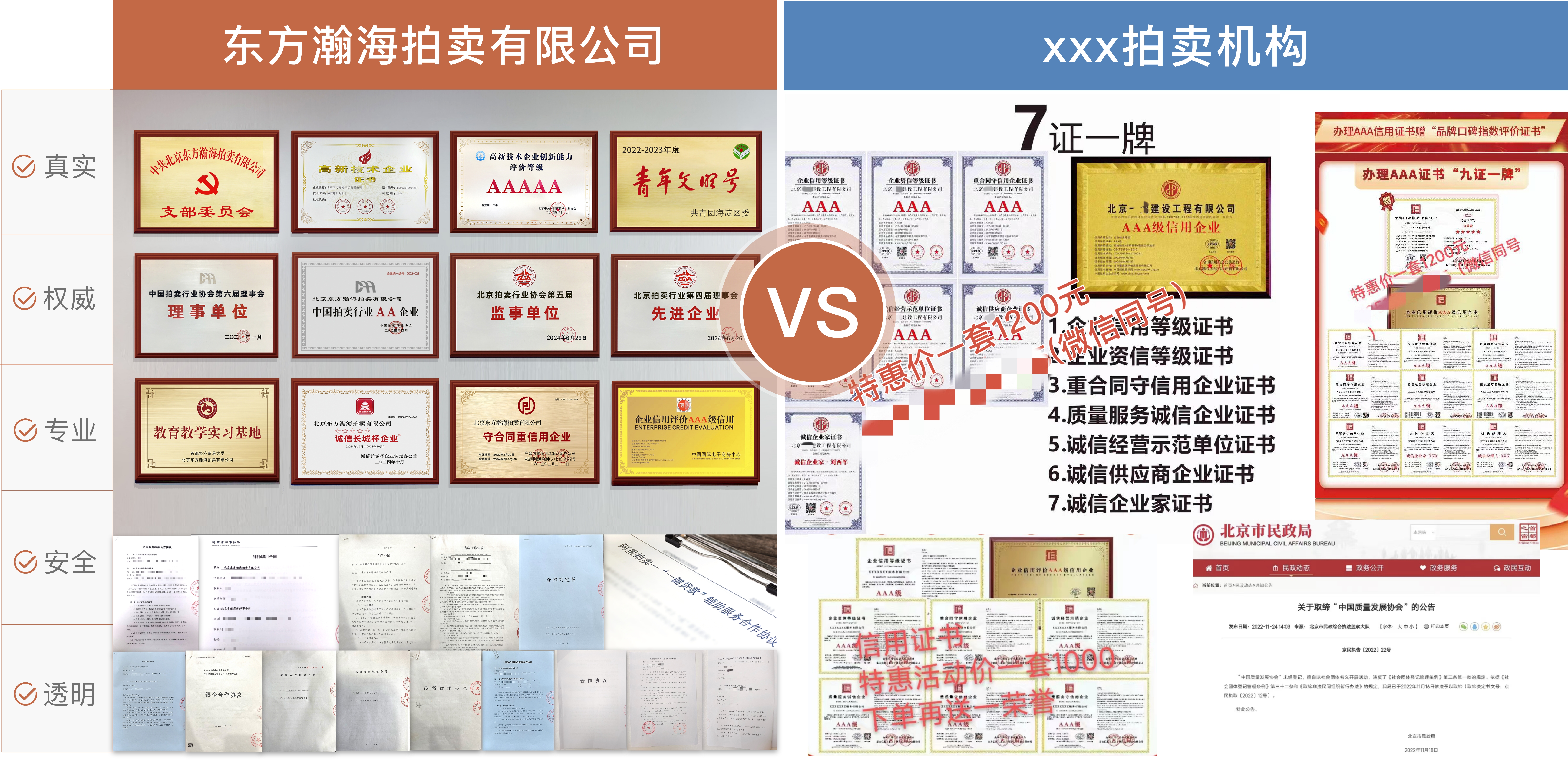 避坑贴士:网上很多山寨的《信用认证》《3.15可信赖产品企业》《重合同认证》《质量服务认证》《诚信经营证书》《杰出实于企业家认证》等等,在"某宝"的标价为50-1000元,即可定制想要的任何名称的"荣誉证书和牌匾",同时一些所谓信用评价的颁发单位,如:中国质量发展协会等,早被民政局向社会明令公告”取缔非法民间组织”,客户在选择拍卖机构时,一定要认真鉴别其获得的"证书或牌匾"是否山寨和非法、其颁发机构是否为政府等公信单位,如果授予单位本身都没有公信力非法民间组织,宣传的证书样式和授予单位基本一致,十有八九就是成套购买的"山寨证",市面不少拍卖服务机构为了骗取客户信任,购买成套”证书和牌匾",老百姓一定要谨慎考虑,避免骗取信任而产生巨大的经济损失。广大客户一定鉴别各拍卖企业对外宣传的真实性,都属于"虚假宣传",均可在"市场监督局"12315进行投诉,避免老百姓被各虚假宣传误导而上当受骗。 -